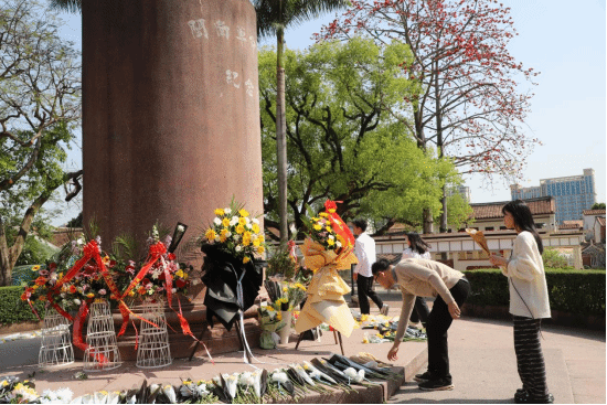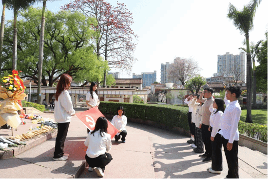 在中山公园的闽南革命烈士纪念碑前,参与活动的党员和团员向纪念碑行鞠躬礼并敬献鲜花。随后,党员、团员们面向纪念碑,在领誓人的带领下分别重温入党、入团誓词。