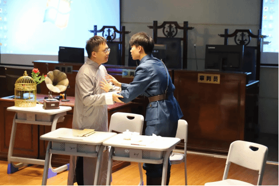 在观看一台好戏中,学院展演讲述“左联五烈士”之一殷夫事迹的舞台剧《生命·爱情·自由》选段,该剧由我院拂晓剧社成员承演,曾在校“两赛”小品小戏专场荣获优秀剧目奖。通过沉浸式红色教育,引导新生传承红色基因。