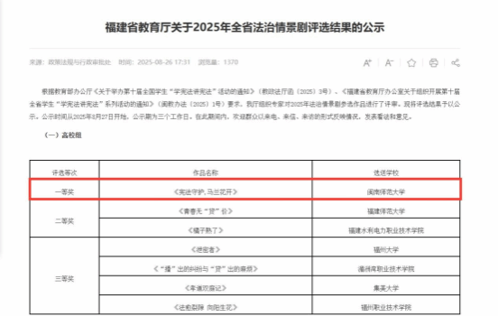 在本届活动中首次设置的法治情景剧评选中,2023级社会工作班何小雨与2024级法学3班的朱禹霏、王金波等同学参演的剧目《宪法守护,马兰花开》荣获全省一等奖。该剧取材自我校2004届校友、时代楷模“闽宁对口扶贫协作援宁群体”教育代表李丹老师的事迹,以贫困生小彤的视角,生动展现支教老师在宪法指引下跨越山海、资助贫困生、守护学生受教育权的感人故事。