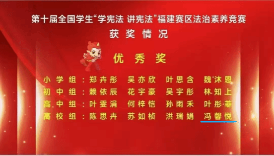 23法学1班的冯馨悦同学凭借对宪法知识的精准掌握与深刻理解,在法治素养竞赛高校组中取得全省第10名的优异成绩,荣获优秀奖