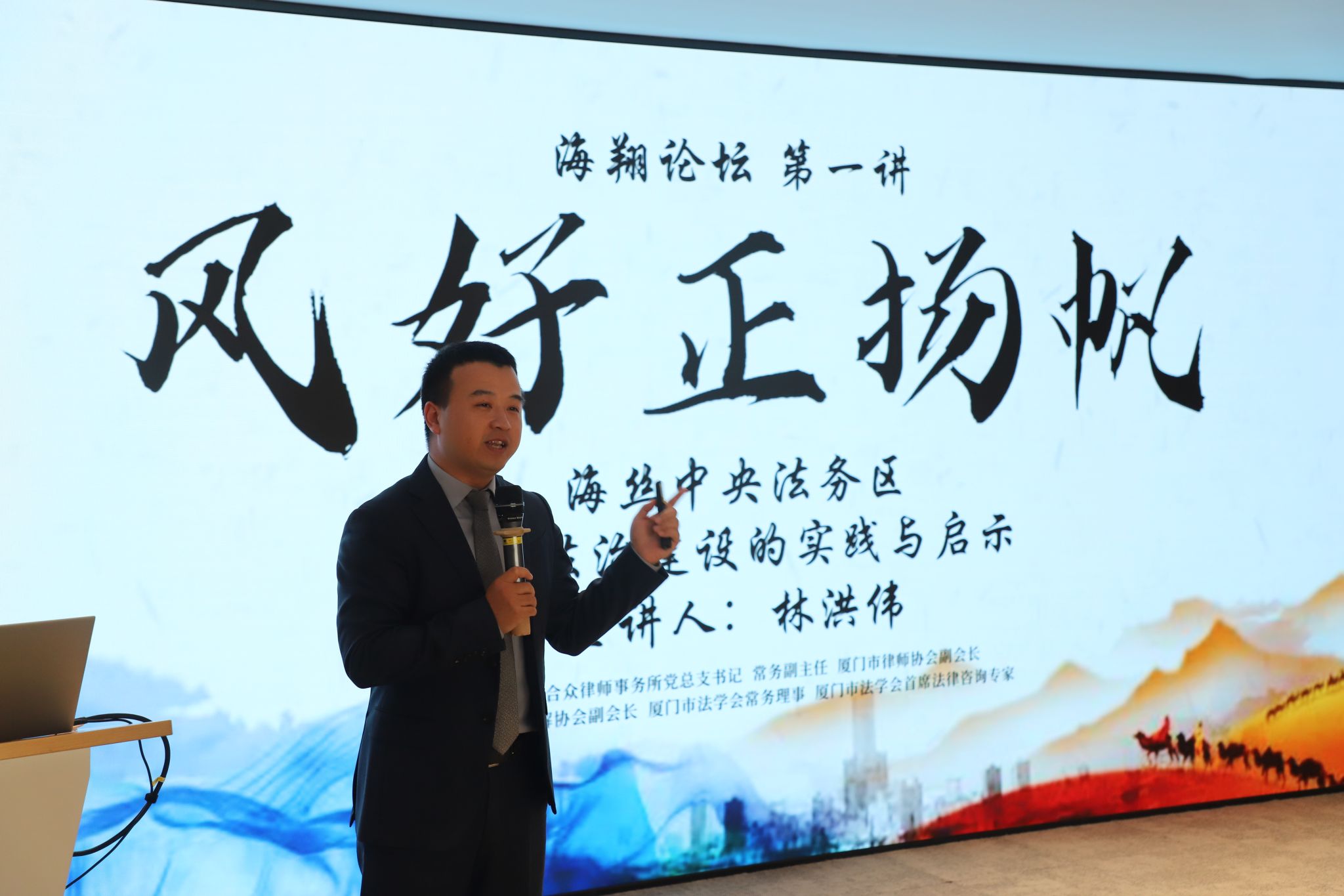 开班仪式后,闽南师范大学法学院“海翔论坛”第一讲由厦门市律师协会副会长林洪伟律师开讲,围绕涉外法律服务实践与海丝中央法务区建设,为学员带来前沿实务视角。
